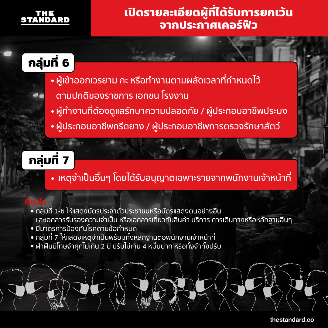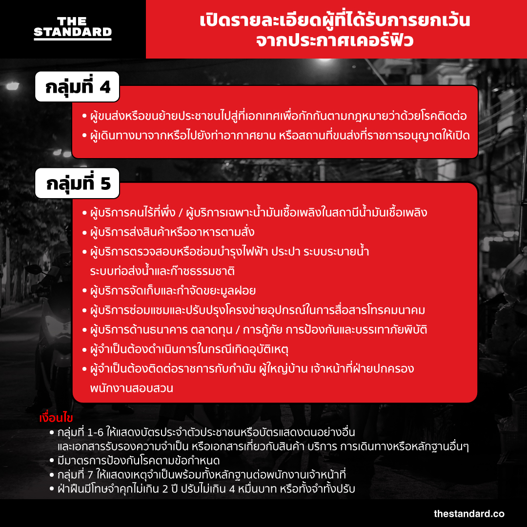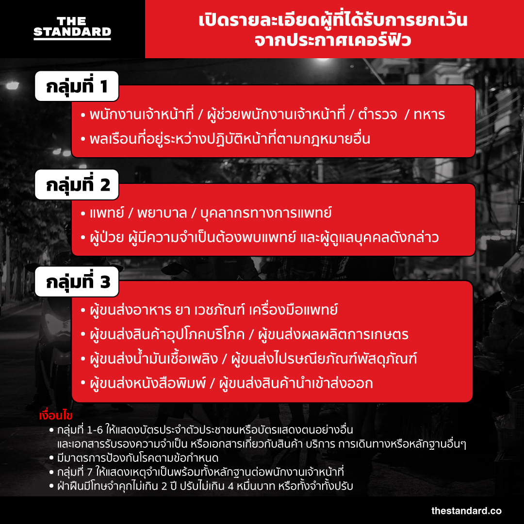 วันนี้ (10 เมษายน) นายกรัฐมนตรีได้อาศัยอำนาจจากการประกาศสถานการณ์ฉุกเฉินออกข้อกำหนดเพิ่มเติม ฉบับที่ 3 อนุญาตให้ผู้ปฏิบัติงาน และอาชีพดังต่อไปนี้ ออกนอกเคหสถานได้หลังเวลาเคอร์ฟิว มีผลตั้งแต่วันที่ 10 เมษายนเป็นต้นไป