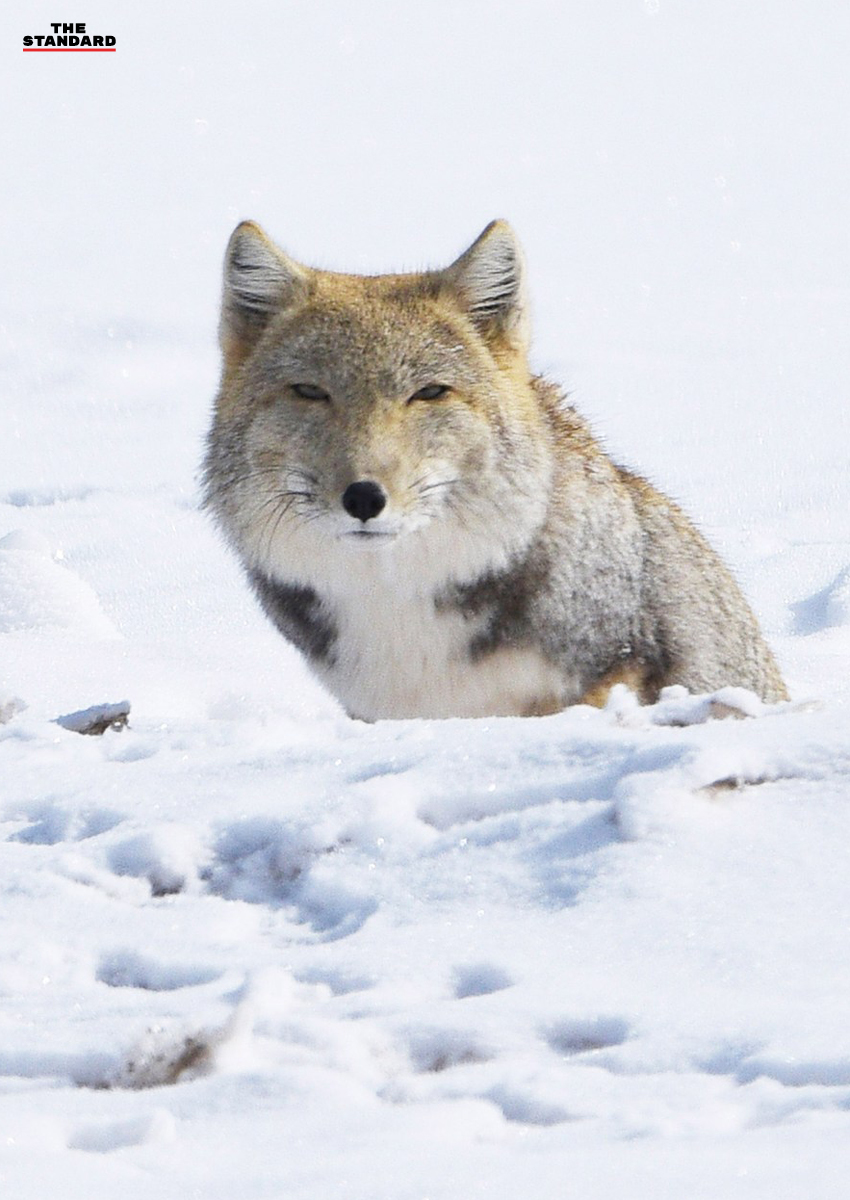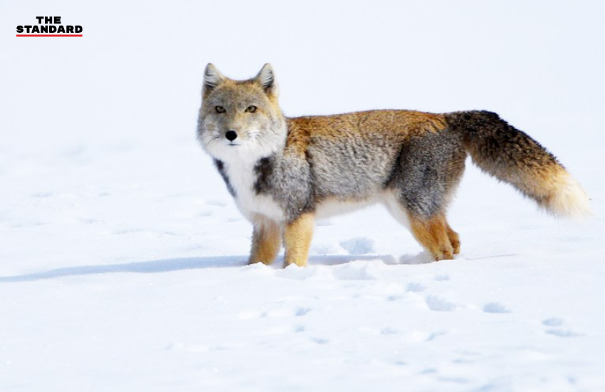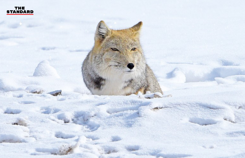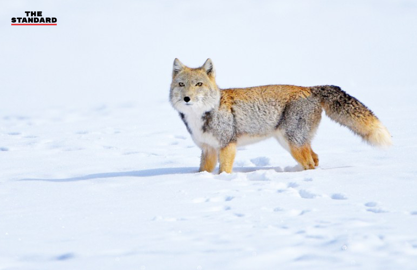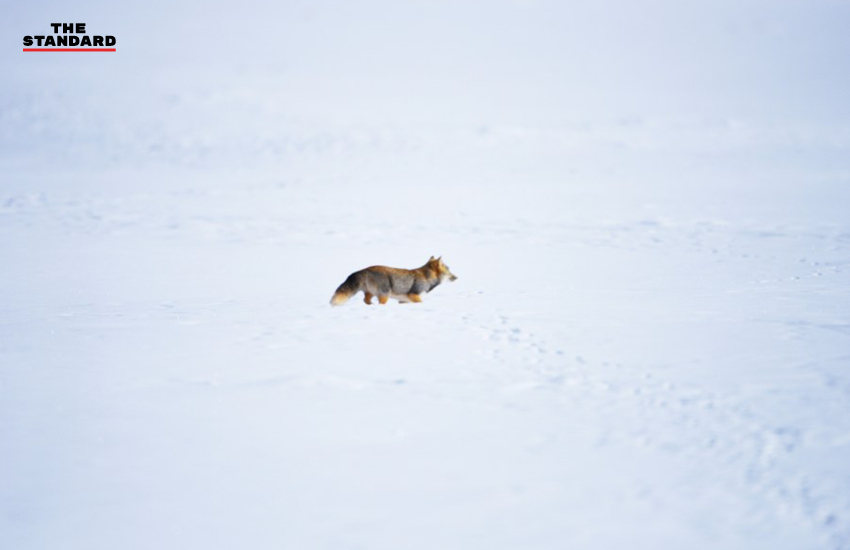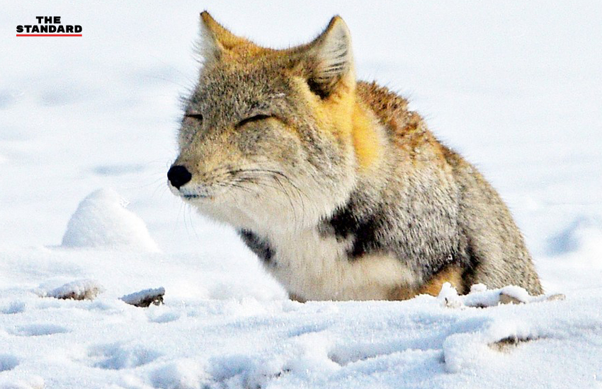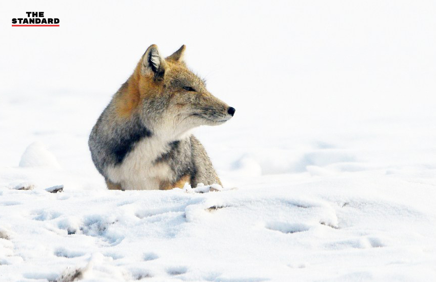 ชมภาพสุนัขจิ้งจอกทิเบต สิ่งมีชีวิตที่มีเอกลักษณ์คือใบหน้าเรียบเฉยราวกับเบื่อโลกใบนี้ยิ่งนัก ที่ออกมาเยื้องย่างกลางหิมะ ในตำบลอาเลยเถิง อำเภอปกครองตนเองอาเค่อซาย กลุ่มชาติพันธุ์คาซัค เมืองจิ่วเฉวียน มณฑลกานซู่ ทางตะวันตกเฉียงเหนือของจีน