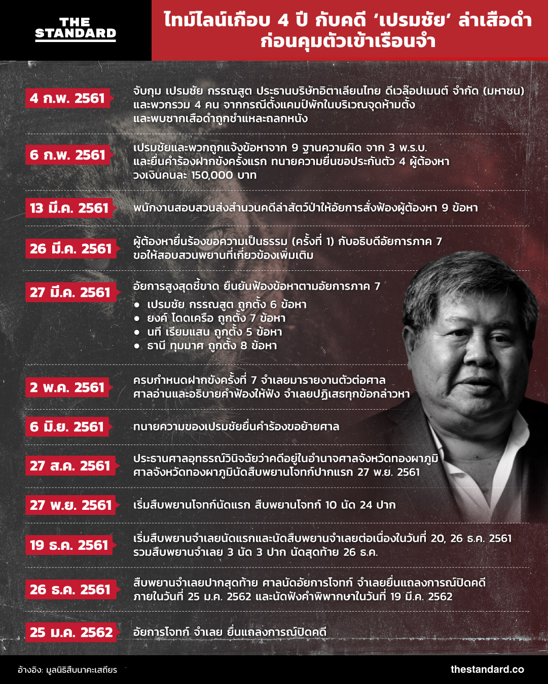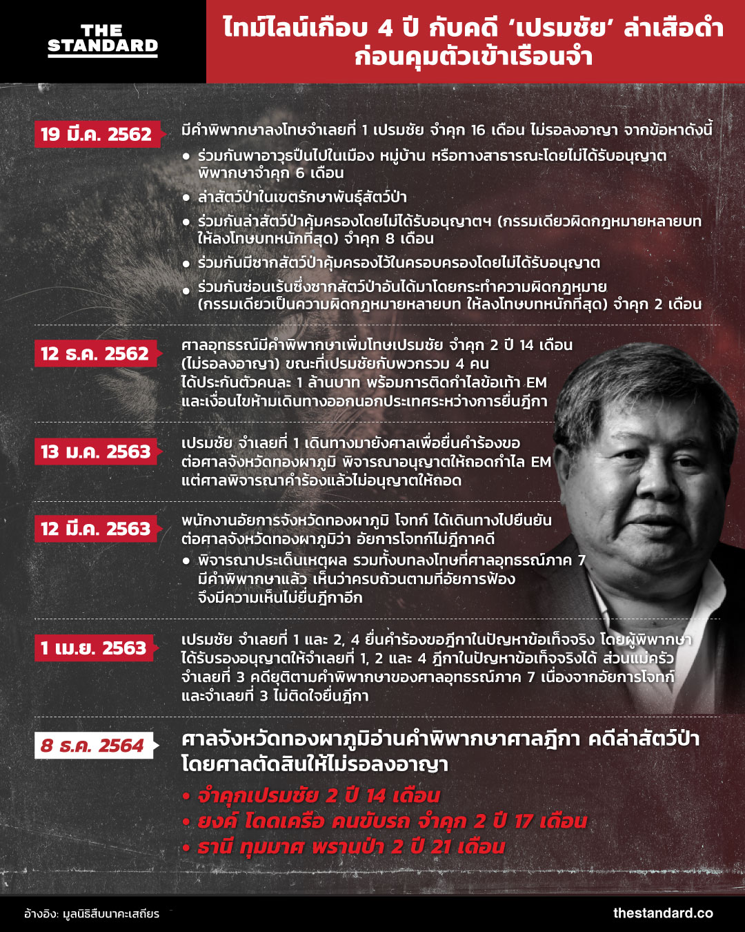 เป็นเวลาเกือบ 4 ปีแล้ว สำหรับคดีล่าเสือดำ ซึ่งในวันนี้ศาลจังหวัดทองผาภูมินัดอ่านคำพิพากษาของศาลฎีกา ที่พนักงานอัยการจังหวัดทองผาภูมิเป็นโจทก์ยื่นฟ้อง เปรมชัย กรรณสูต ประธานบริหาร บริษัทอิตาเลียนไทย ดีเวล๊อปเมนต์ จำกัด (มหาชน) และพวกรวม 4 คน