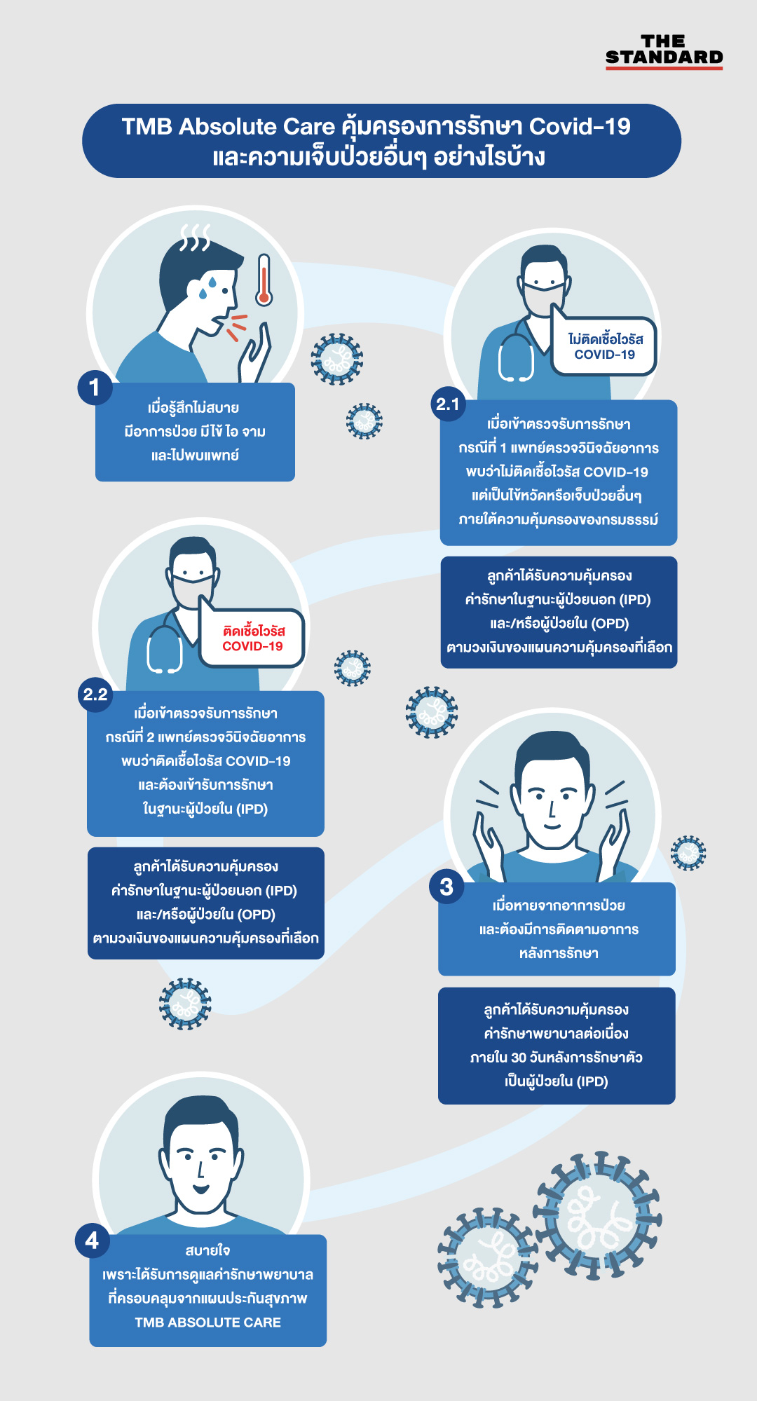 • หากติดโควิด-19 ไม่เพียงกระทบต่อการทำงาน แต่ยังต้องพักรักษาตัวเพื่อให้แพทย์ดูแลอย่างใกล้ชิดจนกระทั่งอาการทุเลาและหายขาดย่อมกินเวลานานนับสัปดาห์ นอกจากจะสูญเสียรายได้แล้วยังหมายถึงค่าใช้จ่ายในการรักษาตัวจำนวนไม่น้อย แล้วเราจะมีความพร้อมในการรับมือสถานการณ์สักแค่ไหน หากในที่สุดแล้วพบว่าตัวเองติดเชื้อ