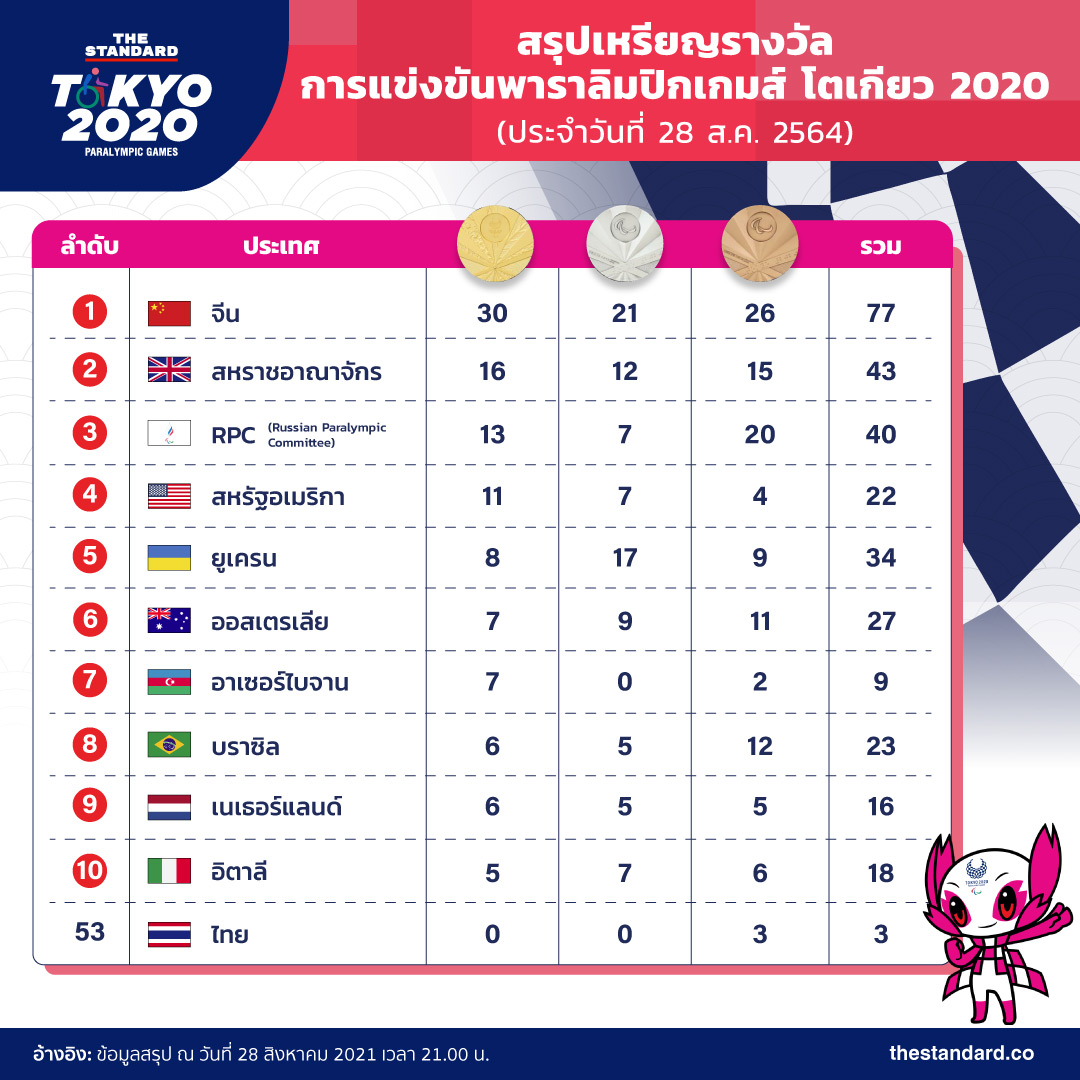 สรุปเหรียญรางวัลการแข่งขันพาราลิมปิกเกมส์ โตเกียว 2020 (วันที่ 28 สิงหาคม 2021)
