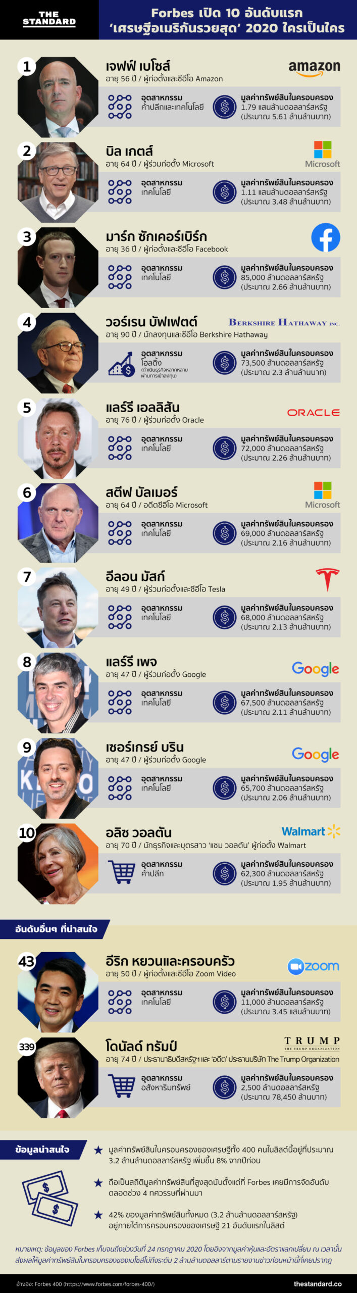 เมื่อ Forbes ได้เปิดเผยรายชื่อของเศรษฐีชาวอเมริกันกว่า 400 รายที่มีมูลค่าทรัพย์สินในครอบครองมากที่สุด หรือ Forbes 400 ประจำปี 2020 แต่ละคนจะเป็นใครบ้าง และดำเนินธุรกิจในอุตสาหกรรมใด เราได้รวบรวมข้อมูลสรุปเอาไว้ให้คุณแล้ว