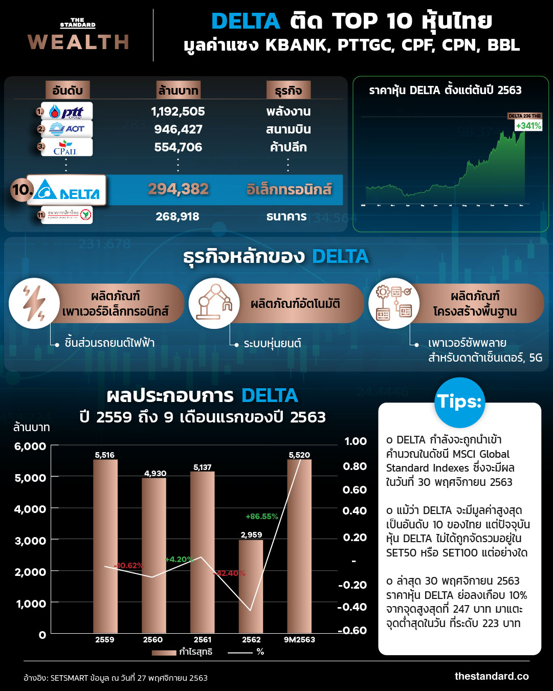 ราคาหุ้น เดลต้า อีเลคโทรนิคส์ (ประเทศไทย) หรือ DELTA พุ่งขึ้น 341% นับจากต้นปี 2563 จนถึงวันที่ 27 พฤศจิกายนที่ผ่านมา จนมูลค่าบริษัทเพิ่มขึ้นมาเป็น 2.94 แสนล้านบาท ติดอันดับ 10 ของไทย แซงหน้าหุ้นอย่าง KBANK, PTTGC, CPF, CPN รวมถึง BBL หลังจากกำไรสุทธิของบริษัทเพียง 9 เดือนของปีนี้ทำได้ 5,520 ล้านบาท มากกว่าปีก่อนทั้งปีแล้วถึง 86.5%