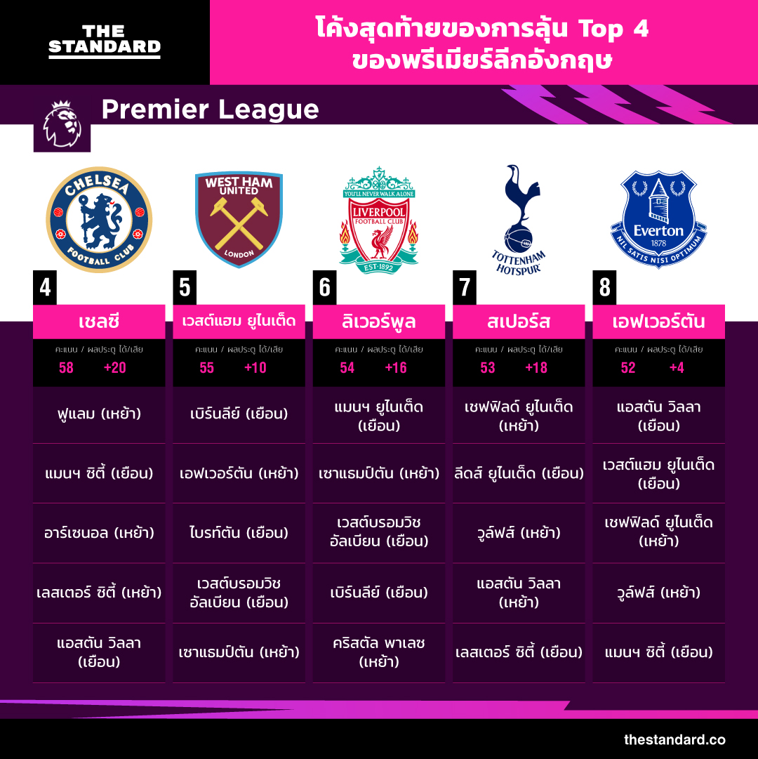 ในส่วนของอันดับที่ 4-8 นั้น ยังคงมีลุ้นในการทำคะแนนขึ้นมาจบในอันดับท็อป 4 ที่จะคว้าสิทธิ์ไปแข่งขันฟุตบอลยูฟ่าแชมเปียนส์ลีกในฤดูกาลหน้า
