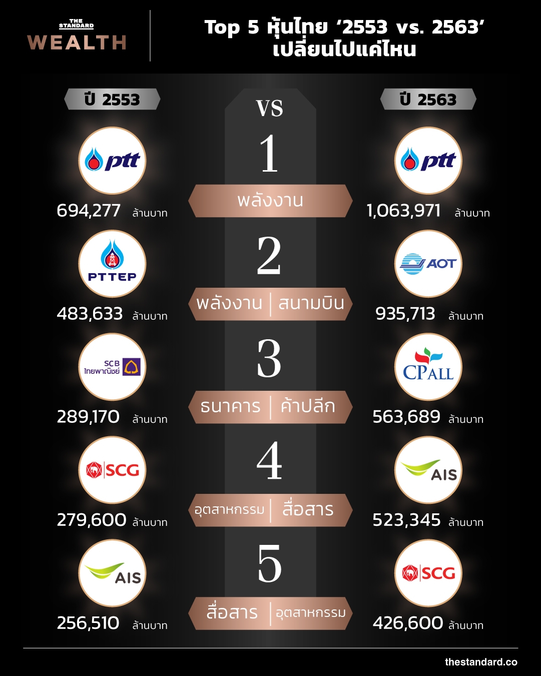Top 5 หุ้นไทย 10 ปีที่ผ่านมา ปตท. (PTT) ยังคงเป็นหุ้นอันดับหนึ่งที่มีมูลค่าสูงสุด เพิ่มจาก 694,277 ล้านบาท มาเป็น 1,063,971 ล้านบาท โดยสองบริษัทที่มีมูลค่าเพิ่มขึ้น และแทรกเข้ามาติดชาร์ตในอันดับ 2 และอันดับ 3 คือ ท่าอากาศยานไทย (AOT) และ ซีพี ออลล์ (CPALL)