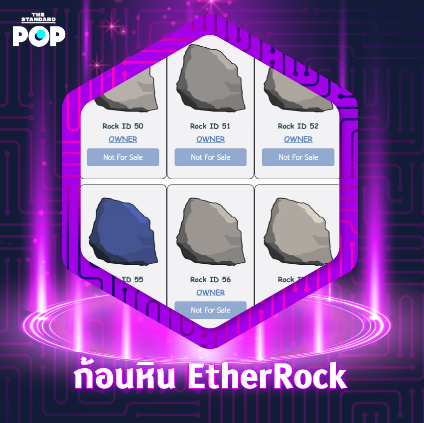 ใครจะไปคิดว่าภาพก้อนหินธรรมดาๆ ก้อนหนึ่ง จะมีมูลค่าสูงถึง 900 ETH หรือราวๆ 99.7 ล้านบาท ก้อนหินที่แพงที่สุดในโลกนี้คือ EtherRock #55 หนึ่งใน NFT ของคอลเล็กชันก้อนหินหลากสีที่มีเพียง 100 ชิ้น ซึ่งถูกสร้างขึ้นมาในปี 2017 เป็นคอลเล็กชัน NFT แรกๆ ของโลกที่มาหลังโปรเจกต์ในตำนานอย่าง CryptoPunks ไม่นาน ด้วยราคาที่สูงลิ่วขนาดนี้ก็ทำให้ราคาหินก้อนอื่นๆ ขยับไปอยู่ในราคาที่สูงถึง 321 ETH หรือประมาณ 35 ล้านบาท แม้มูลค่าของ EtherRock จะมากกว่าคฤหาสน์สุดหรู 2 หลัง แต่ก้อนหินดิจิทัลนี้ก็ไม่ได้มีประโยชน์อะไรทั้งนั้นนอกจากเก็บสะสมและขายทำกำไร