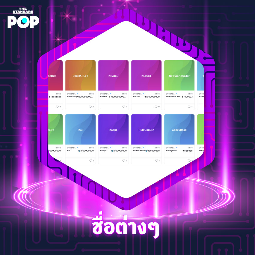 ชื่อเรียกก็มีการซื้อขายเป็น NFT เหมือนกัน เพราะในตลาด OpenSea ก็มีร้านขายชื่ออย่าง Decentraland, ENS (Ethereum Name Service), Unstoppable Domains และอีกหลายเจ้าที่ขายชื่อเว็บไซต์ ชื่อโดเมน รวมทั้งชื่ออวตารในเกม เพื่อให้ผู้ซื้อสามารถเป็นเจ้าของชื่อนั้นได้อย่างแท้จริง โดยไม่มีใครสามารถใช้ซำ้ เซ็นเซอร์ หรือเอาออกได้ เป็นการแก้ปัญหาที่มีโอกาสเกิดขึ้นได้ นอกจากนี้ชื่อต่างๆ ที่ถูกลงท้ายด้วย .eth, .crypto, .nft ฯลฯ ยังสามารถใช้เป็นลิงก์สำหรับกระเป๋าคริปโตของเราที่ใครๆ ก็หาเจอได้ใน Etherscan แทนที่จะเป็นโค้ดปกติที่มีความยาวและซับซ้อน ล่าสุดชื่อโดเมนที่ขายได้แพงที่สุด ได้แก่ win.crypto จบที่มูลค่า 1 แสนดอลลาร์ หรือประมาณ 3.3 ล้านบาท จาก Unstoppable Domains