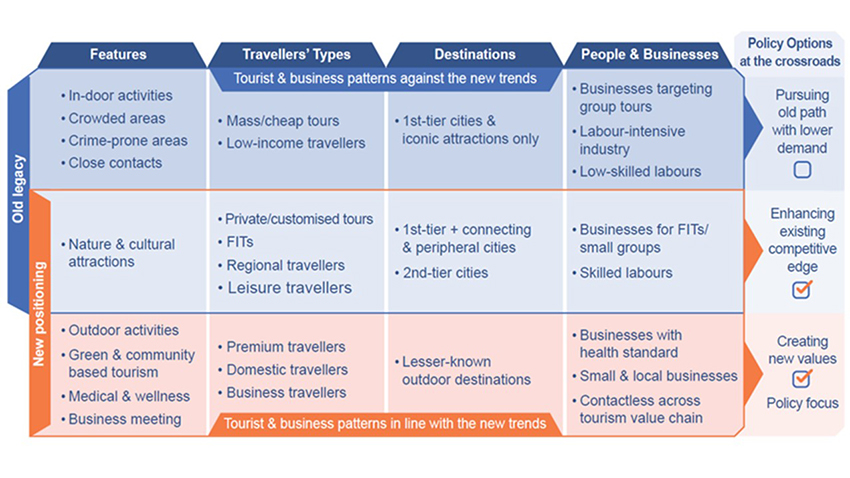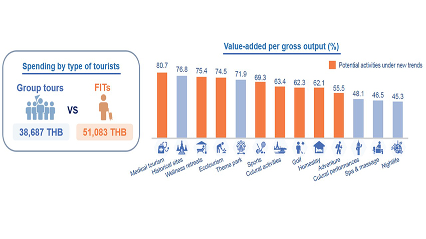 ไทยควร Reposition ภาคการท่องเที่ยว โดยเน้นการท่องเที่ยวกลุ่มที่คาดว่าจะมีความต้องการเพิ่มขึ้น โดยเริ่มจากการต่อยอดกิจกรรมที่ไทยมีศักยภาพในการแข่งขันเดิม (Old Legacy) อยู่แล้ว เช่น ด้านธรรมชาติหรือวัฒนธรรม ควบคู่กับสร้างกิจกรรมใหม่ๆ เช่น การท่องเที่ยวเชิงสุขภาพ การท่องเที่ยวที่ได้สัมผัสชีวิตคนท้องถิ่นที่เพิ่มมูลค่าและแรงจูงใจ พร้อมไปกับการขยายกลุ่ม/ความถี่ของการท่องเที่ยวของนักท่องเที่ยวทั้งไทยและต่างชาติในภูมิภาค (Regional Travelers) เช่น ญี่ปุ่น ไต้หวัน จากแนวโน้มการปรับพฤติกรรมที่นักท่องเที่ยวจะเลือกเดินทางท่องเที่ยวระยะใกล้มากขึ้น โดยเฉพาะนักท่องเที่ยวที่นิยมเดินทางด้วยตนเอง (Free Independent Travelers: FIT) หรือกลุ่ม Customized Tour ซึ่งจะใช้จ่ายต่อทริปประมาณ 51,000 บาทต่อคน สูงกว่ากรุ๊ปทัวร์ที่ประมาณ 39,000 บาท และเน้นการรองรับนักท่องเที่ยว 3 กลุ่มหลัก ได้แก่