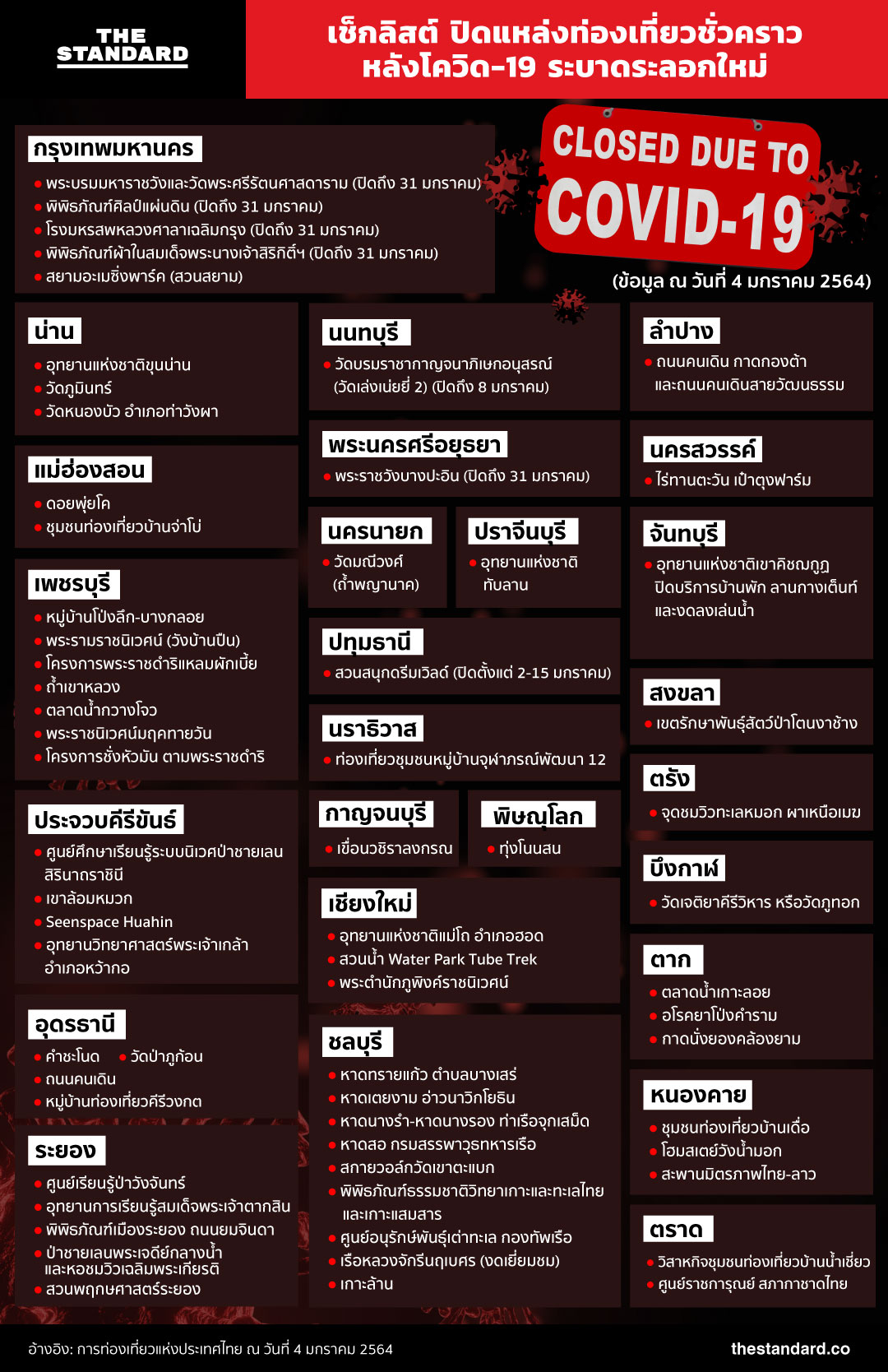 หลังการแพร่ระบาดของโควิด-19 ระลอกใหม่ ซึ่งเวลานี้ได้ขยายวงออกไปกว่า 56 จังหวัดทั่วประเทศ ทำให้ต้องมีมาตรการเข้มข้นในการป้องกันการแพร่ระบาดของโรค หลายจังหวัดได้มีการประกาศปิดสถานที่ท่องเที่ยว เพื่อไม่ให้เสี่ยงต่อการรวมตัว การท่องเที่ยวแห่งประเทศไทย ได้รวบรวมข้อมูลสถานที่ท่องเที่ยวที่ถูกปิด ณ วันที่ 4 มกราคม 2564 และจะเปิดให้ท่องเที่ยวเวลาใด ต้องติดตามประกาศจากหน่วยงานในพื้นที่อีกครั้ง