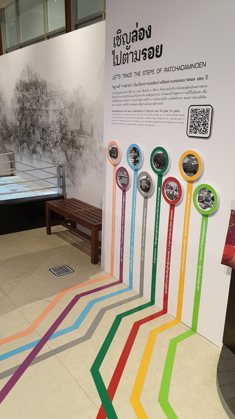 ผังนิทรรศการเรื่อง ‘อยู่ราชดำเนิน’ จะเห็นได้ว่าเส้นสีม่วงนี้ตัดกับเส้นสีต่างๆ ซึ่งทำให้เกิดความทรงจำร่วม