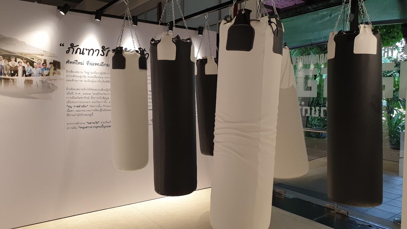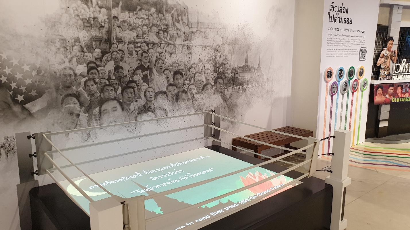 นิทรรศการนี้จึงเริ่มต้นทางเข้าชมด้วยการนำกระสอบทรายมาขวางทางเข้า ซึ่งก็ดูจะสอดคล้องกันดีกับการที่ถนนแห่งนี้มีเวทีมวยราชดำเนินอยู่ด้วย รวมถึงการเล่าเรื่องเหตุการณ์ทางประวัติศาสตร์อย่างสนุกสนานผ่านเสียงการพากย์มวย นัยว่าต้องการสะท้อนให้เห็นว่า ถนนราชดำเนินนี้เป็นพื้นที่สำคัญต่อการทำความเข้าใจเรื่องพื้นที่ของการปะทะการประชัน (Contested Space) กันระหว่างขั้วอำนาจ