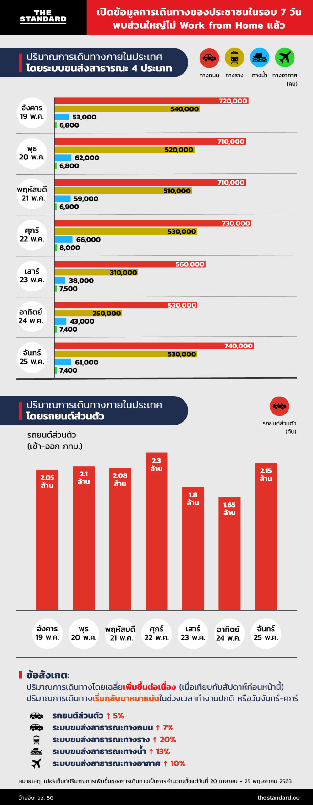 THE STANDARD รวบรวมข้อมูลปริมาณการเดินทางภายในประเทศในรอบ 7 วันล่าสุดมาให้ได้ดูกันว่าพฤติกรรมการออกมาใช้ระบบขนส่งสาธารณะหรือเดินทางด้วยรถส่วนตัวเป็นอย่างไรบ้าง