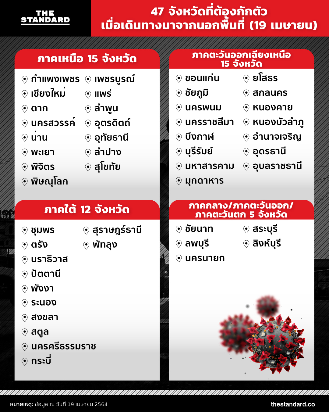 วันนี้ (19 เมษายน) ศูนย์บริหารสถานการณ์การแพร่ระบาดของโรคติดเชื้อไวรัสโคโรนา 2019 กระทรวงมหาดไทย (ศบค.มท.) ได้เผยแพร่ข้อมูลล่าสุด จังหวัดที่มีคำสั่งหรือประกาศให้มีการกักกันตัวผู้ที่เดินทางมาจากนอกพื้นที่รวม 47 จังหวัด