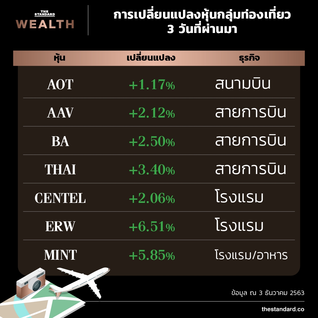 ในรอบสัปดาห์ที่ผ่านมา หุ้นที่เกี่ยวเนื่องกับการท่องเที่ยวเผชิญกับทั้งปัจจัยบวกและปัจจัยลบเข้ามาพร้อมๆ กัน โดยปัจจัยบวกมาจากการที่ ศบศ. เห็นชอบปรับปรุงและขยายเวลาสำหรับโครงการ ‘เราเที่ยวด้วยกัน’ รวมถึงการที่ ‘อังกฤษ’ เป็นประเทศแรกในโลกที่อนุมัติวัคซีนต้านโควิด-19 ให้สามารถเริ่มแจกจ่ายได้