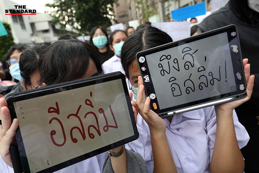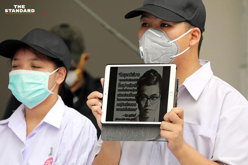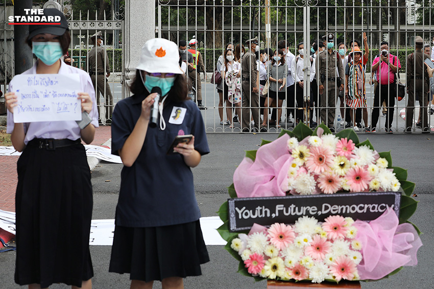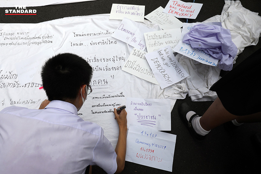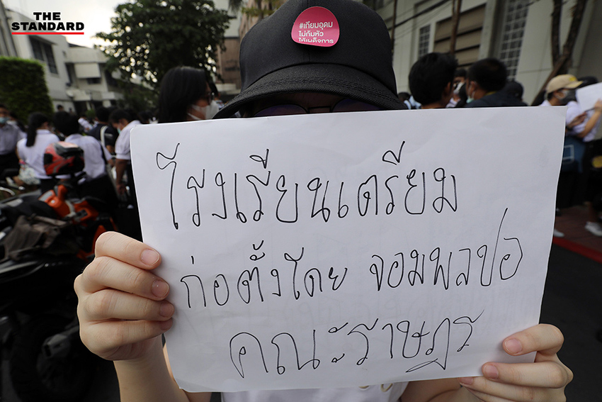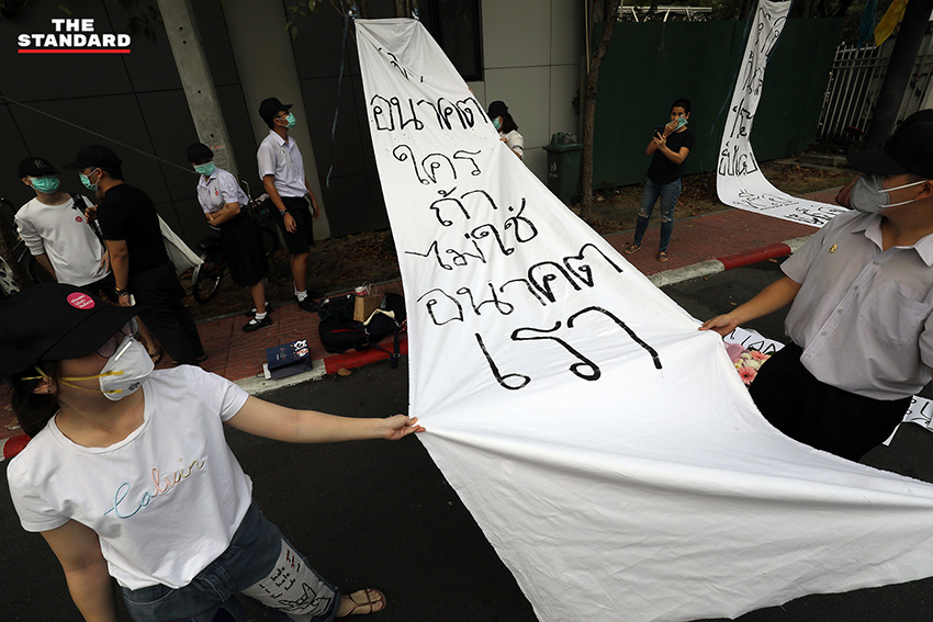 ในการรวมตัวของนักเรียนเตรียมอุดมศึกษา มีป้ายข้อความเสียดสีการเมืองล้อเลียน พล.อ. ประยุทธ์ จันทร์โอชา นายกรัฐมนตรี มีป้ายผ้าสีขาว ข้อความเขียนด้วยตัวอักษรสีดำ ‘อนาคตใครถ้าไม่ใช่อนาคตเรา’ พร้อมติดแฮชแท็ก #เกียมอุดมไม่ก้มหัวให้เผด็จการ