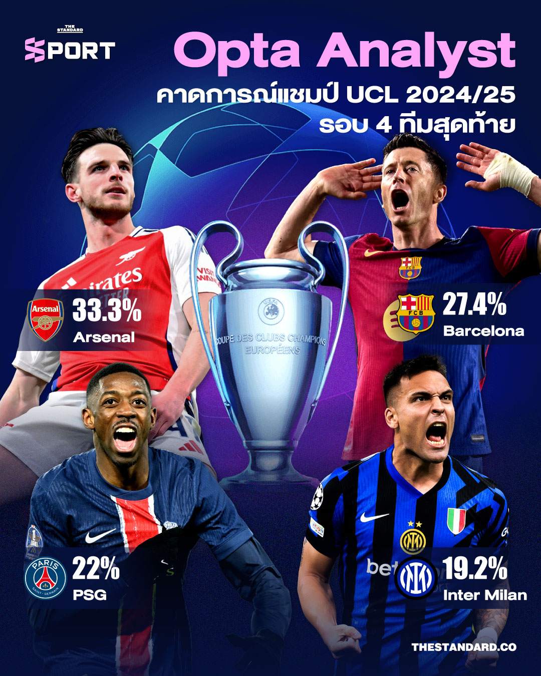 ก่อนการแข่งขันฟุตบอลยูฟ่าแชมเปียนส์ลีก 2024/25 รอบรองชนะเลิศนัดแรกจะเริ่มต้นขึ้น Opta Analyst เปิดเผยผลการวิเคราะห์จากซูเปอร์คอมพิวเตอร์เกี่ยวกับโอกาสคว้าแชมป์ของ 4 ทีมสุดท้ายในฤดูกาลนี้