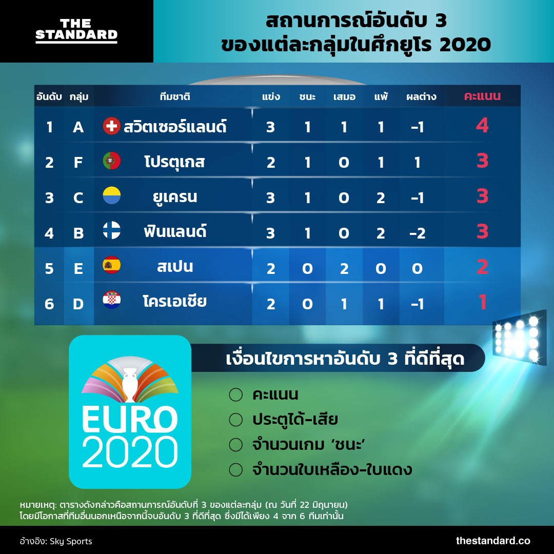 THE STANDARD สรุปสถานการณ์ล่าสุดตอนนี้มาให้ชมกันว่า ‘ทีมอันดับ 3’ ของแต่ละกลุ่มมีทีมใดบ้าง และเงื่อนไขในการหาทีมอันดับ 3 ที่ดีที่สุดมีอะไรบ้าง