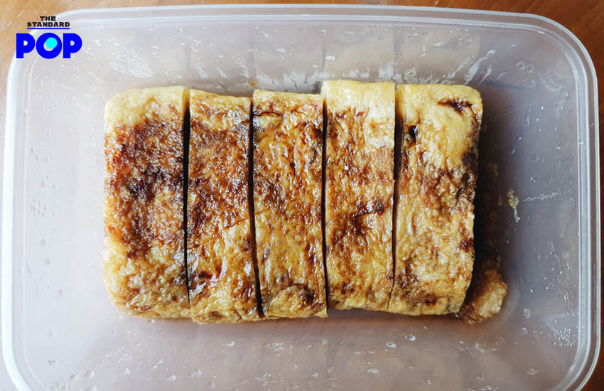 ส่วนอีกเมนูเราสั่งเป็นเมนูกินเล่น ได้แก่ ทามาโกะยากิ (100 บาท) ไข่ม้วนย่างสไตล์ดั้งเดิมที่ทางร้านนำมาปรับสูตรและรสชาติให้มีความก้ำกึ่งระหว่างไข่ม้วนย่างและไข่หวานที่กินกับซูชิ รสชาติเค็มอมหวานกำลังดี จะกินเล่นก็ได้ กินกับข้าวก็เพลิน