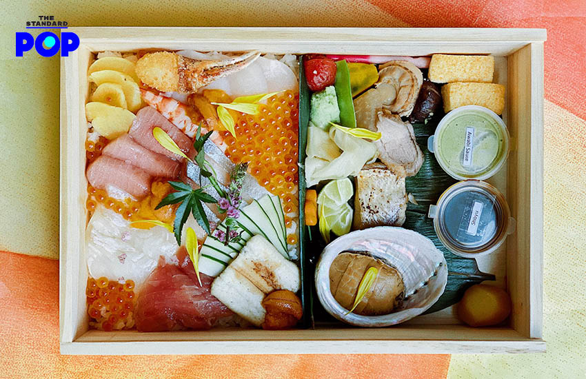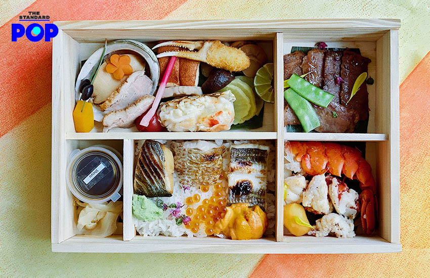 กล่องเบนโตะมีให้เลือกทั้งหมด 4 แบบ เราขอยกกล่องที่ลงมติกันแล้วว่าเป็นขวัญใจมหาชนขึ้นมาแนะนำ กล่องแรกคือ Chirashi Bento (ราคา 2,900 บาท) กล่องนี้มีชื่อเล่น (ที่ตั้งเอง) ว่า ‘ข้าวหน้าเครื่องแน่น’ เหมาะมากสำหรับคนที่ชอบปลาดิบ เพราะฝั่งที่เป็นข้าวหน้าอัดแน่นมาด้วยเหล่าซีฟู้ดสดๆ หลายชนิด ในขณะที่ปลาย่างจะแยกมาอยู่อีกฝั่งกับไข่หวานและเป๋าฮื้อนึ่ง ซึ่งถ้าคุณไม่ใช่สายปลาดิบ กล่องที่สองที่น่าสนใจเรายกให้ Surf and Turf (ราคา 3,500 บาท) กล่องนี้รวมวัตถุดิบเนื้อสัตว์และทะเลไว้ตามชื่อ ประกอบไปด้วย ข้าวยากินิกุด้งเนื้อ A5 กับข้าวหน้าปลาดิบ เคียงข้างมากับล็อบสเตอร์ เป๋าฮื้อนึ่ง และเครื่องเคียงต่างๆ