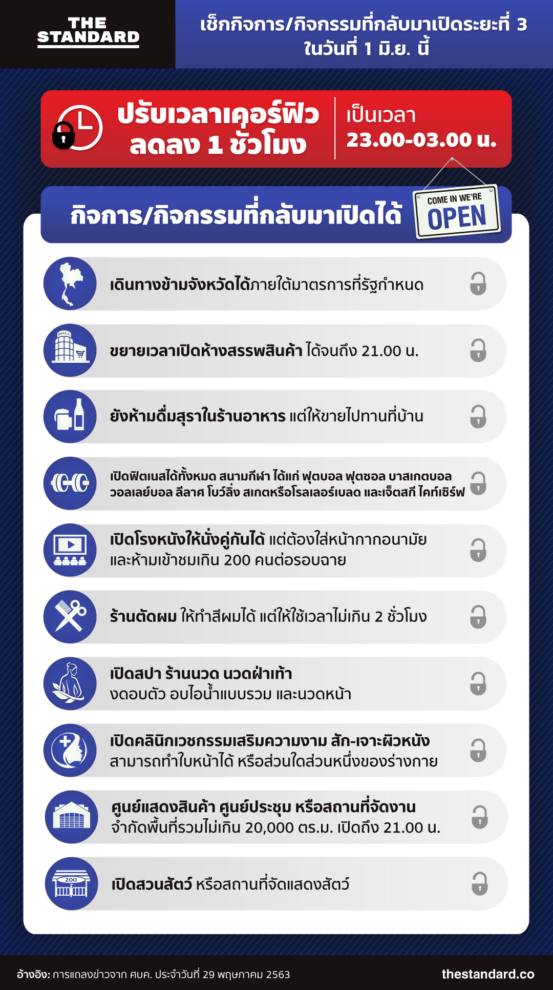 วันนี้ (29 พฤษภาคม) พล.อ. สมศักดิ์ รุ่งสิตา เลขาธิการสภาความมั่นคงแห่งชาติ เปิดเผยข้อสรุปการผ่อนปรนระยะที่ 3 พร้อมประกาศปรับเวลาเคอร์ฟิวลดลง 1 ชั่วโมง เป็นเวลา 23.00-03.00 น. โดยหนึ่งในสาระสำคัญของมาตรการดังกล่าวคือการผ่อนปรนให้กิจการ/กิจกรรมต่างๆ ในกลุ่มที่มีความเสี่ยงปานกลางถึงความเสี่ยงสูงสามารถกลับมาดำเนินการได้อีกครั้ง