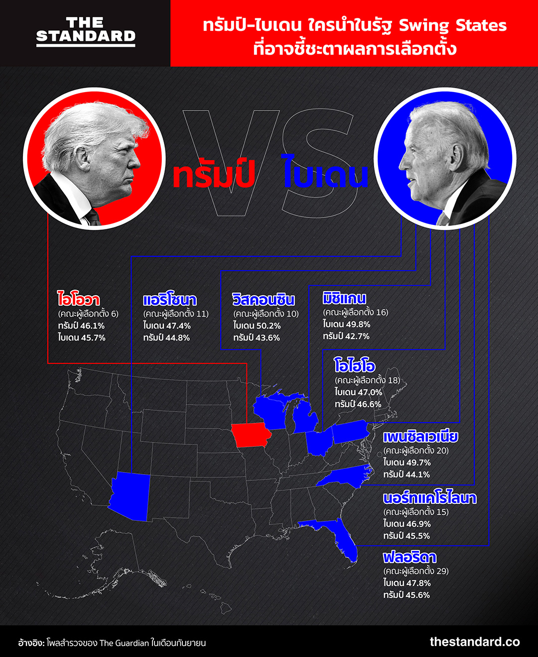 ไปดูกันว่าในโพลล่าสุดช่วงปลายเดือนกันยายนของ The Guardian ที่เผยแพร่บนเว็บไซต์เมื่อวันที่ 4 ตุลาคมที่ผ่านมา ใครมีคะแนนนำในรัฐ Swing States ต่างๆ