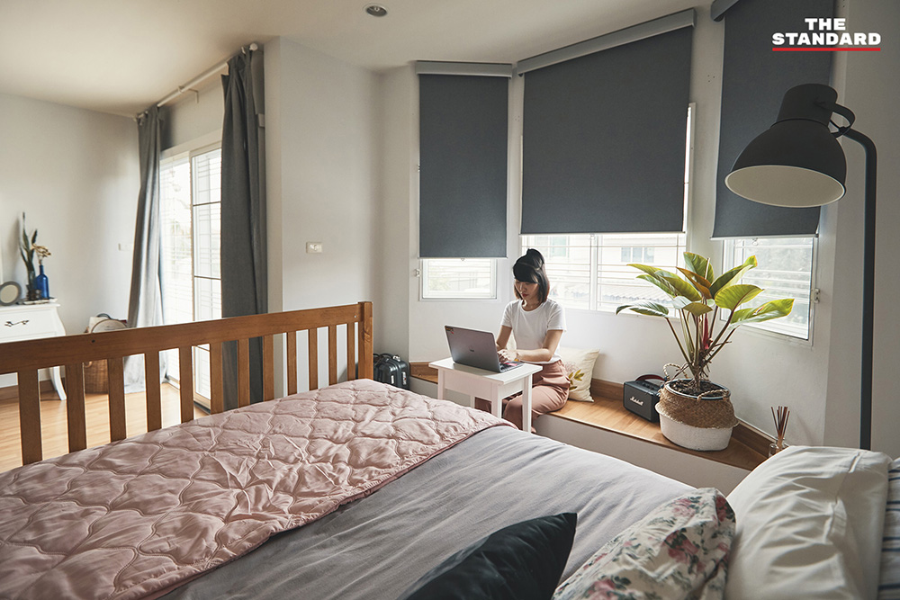 ก้อยเล่าให้เราฟังว่าทำงานที่บ้านมา 2 เดือนกว่าแล้ว หน้าที่ความรับผิดชอบหลักๆ คือการคิดคำสำหรับหน้าเว็บไซต์หรือแอปพลิเคชันต่างๆ แล้วก็เขียนคอนเทนต์ลงบล็อกบ้าง บรรยากาศของการทำงานที่บ้านกับการทำงานออฟฟิศค่อนข้างแตกต่างพอสมควร เนื่องจากงานของก้อยจำเป็นต้องทำงานควบคู่กับอีกฝ่าย ดังนั้นจึงต้องติดต่อสื่อสารกันตลอดเวลา จากเดิมที่นั่งคุยกันแบบต่อหน้าก็ต้องมาคุยผ่านแอปพลิเคชัน Zoom แล้วแชร์หน้าจอกัน ก้อยบอกว่าการสื่อสารมันก็ยากขึ้น ต้องใช้พลังมากขึ้น ต้องอธิบายละเอียดมากขึ้น บางครั้งก็อาจกินเวลาที่ใช้ทำงานมากขึ้น