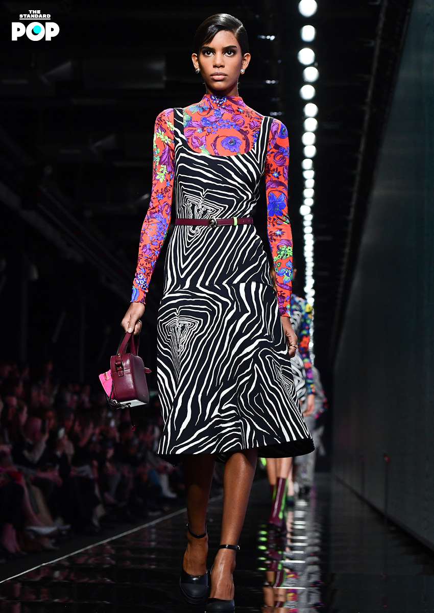 โดยโชว์ถูกแบ่งแยกเป็น 4 หมวดหลัก เริ่มด้วย 8 ลุคแรกที่เน้นโทนสีดำกับไอเท็มคลาสสิก ก่อนจะเข้าช่วงลุคกลางวันที่เน้นไอเท็มแยกชิ้น มีความเป็นอเมริกันสปอร์ตแวร์อย่างเห็นได้ชัดกับลุคชุดวอร์มและเสื้อรักบี้ เป็นต้น (หรือทางเจ้าของแบรนด์อย่าง Capri Holdings อยากจะขยายฐานลูกค้าในอเมริกา?) ต่อด้วยหมวดที่ 3 ที่เน้นไอเท็มลวดลายจัดจ้านอย่างลายม้าลาย ลายดอกไม้ ก่อนจะจบด้วยลุคชุดกลางคืน ซึ่งเป็นกลุ่มสินค้ายอดนิยมของ Versace มาตลอด แม้คอลเล็กชันโดยรวมจะไม่ได้รู้สึกตื่นเต้นมากมายถ้าเทียบกับครั้งก่อนๆ แต่จุดเด่นที่ต้องยกให้คือการตัดเย็บ (Tailoring) ไอเท็มสูทที่เฉียบและเพอร์เฟกต์