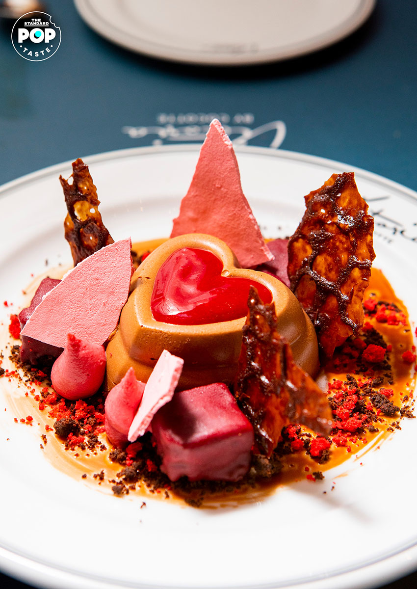 จบด้วยของหวาน Tropical Panna Cotta (290 บาท) ของหวานที่รวมเอาส่วนผสมผลไม้เมืองร้อนมาทำให้เย็นฉ่ำสดชื่น ทั้งพานาคอตต้าครีมมะพร้าว ไอศกรีมเชอร์เบตมะม่วงน้ำดอกไม้ ครีมเสาวรส โรยด้วยครัมเบิลมะพร้าวเพิ่มเท็กซ์เจอร์ มาพร้อมมะม่วงและสับปะรด และสุดพิเศษสำหรับเทศกาลวาเลนไทน์ Valentine’s Day Dessert (360 บาท) มูสช็อกโกแลต Valrhona รูปหัวใจ ตกแต่งด้วยบราวนี่ราสป์เบอร์รี ราสป์เบอร์รีกานาช ช็อกโกแลตตูเล เมอแรงก์ ทั้งหมดราดด้วยซอสราสป์เบอร์รีรสเปรี้ยวหวาน