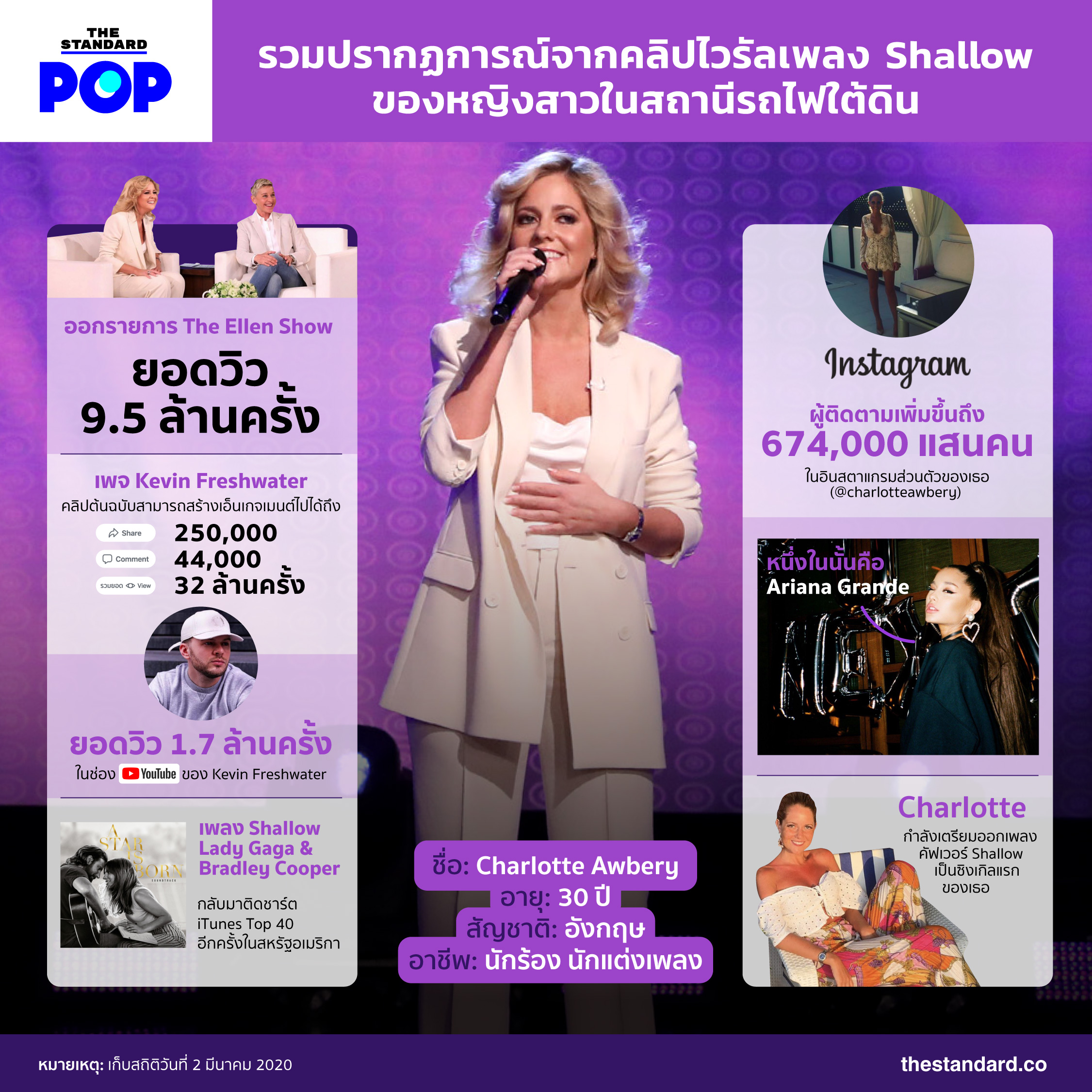 เมื่อกลางเดือนที่ผ่านมาในหน้าฟีดของเราคงได้เห็นคลิปวิดีโอของ Charlotte Awbery หญิงสาวชาวลอนดอนที่ถูกท้าให้เล่น Challenge ‘Finish The Lyrics’ ในเพลง Shallow ของ Lady Gaga และ Bradley Cooper จากภาพยนตร์เรื่อง A Star Is Born ขณะกำลังจะไปขึ้นรถไฟใต้ดิน หลังจากนั้นคลิปของเธอก็ได้กลายเป็นกระแสไปทั่วโลกออนไลน์ และเมื่อปลายสัปดาห์ที่ผ่านมา เธอได้ไปออกรายการ The Ellen Show ถึงนครลอสแอนเจลิสพร้อมกับ Kevin Freshwater เจ้าของรายการดังกล่าว เราจึงรวบรวมปรากฏการณ์จากคลิปดังนี้ เพื่อเป็นเครื่องยืนยันว่า ดาวดวงใหม่ได้เกิดขึ้นเป็นที่เรียบร้อยแล้ว