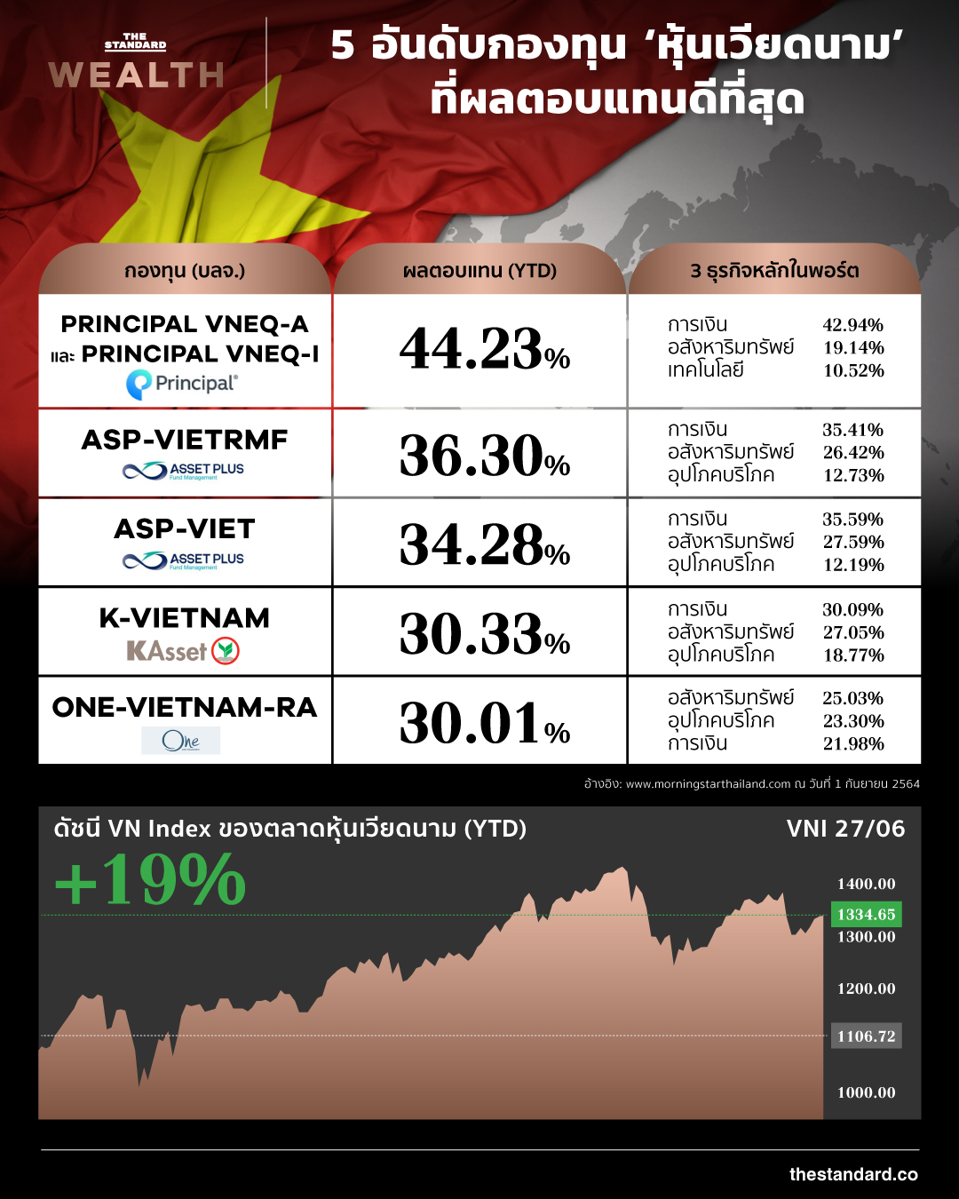 - กองทุนเปิด วรรณ เวียดนาม อิควิตี้ ชนิดไม่จ่ายเงินปันผล สำหรับผู้ลงทุนทั่วไป (ONE-VIETNAM-RA) ให้ผลตอบแทน 28.40%