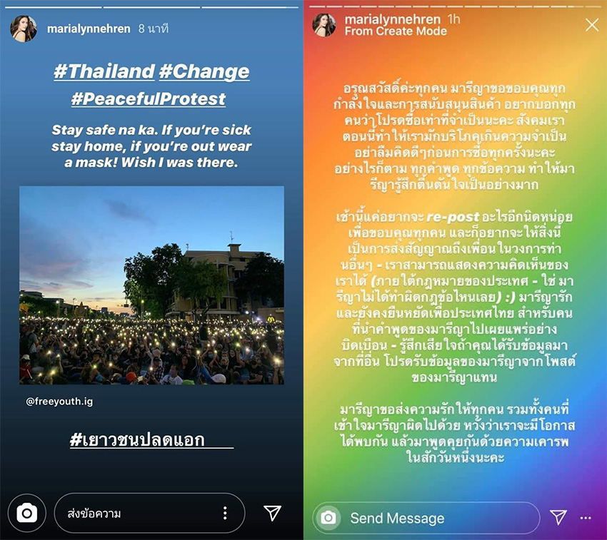 มารีญาโพสต์แสดงความคิดเห็นทางการเมืองผ่านอินสตาแกรม @marialynnehren