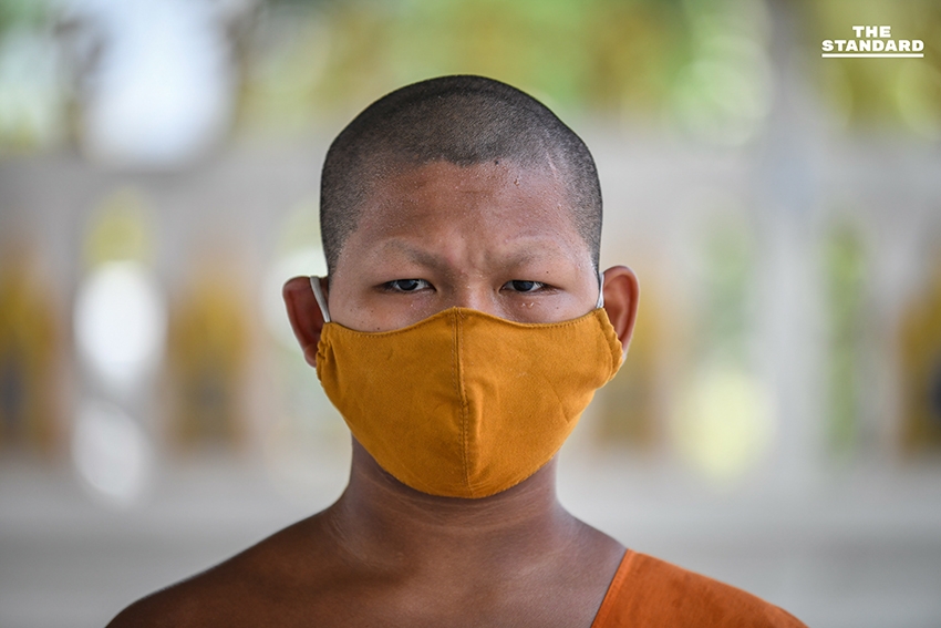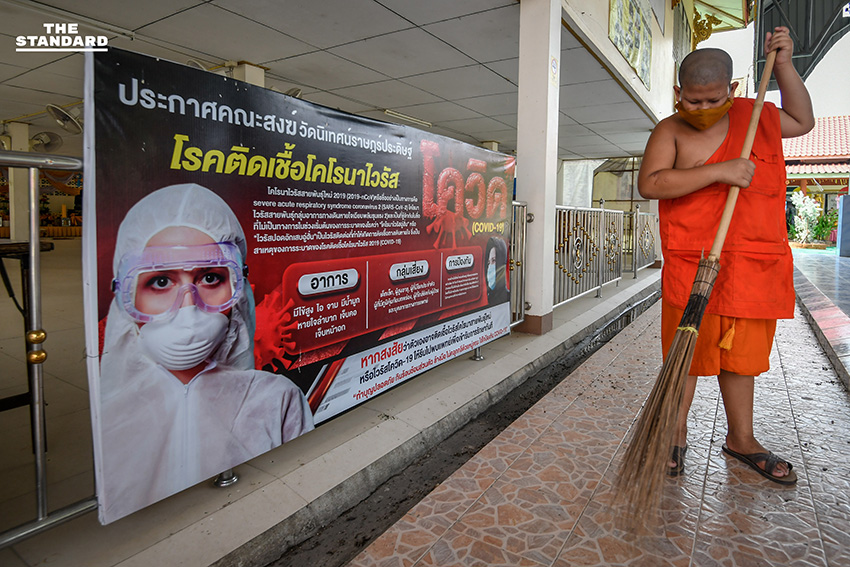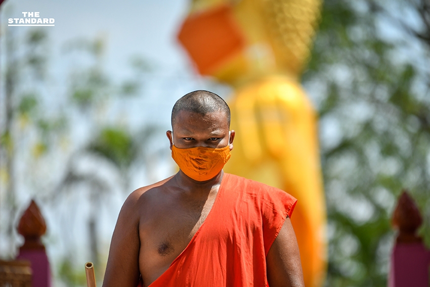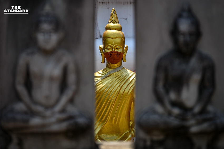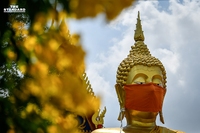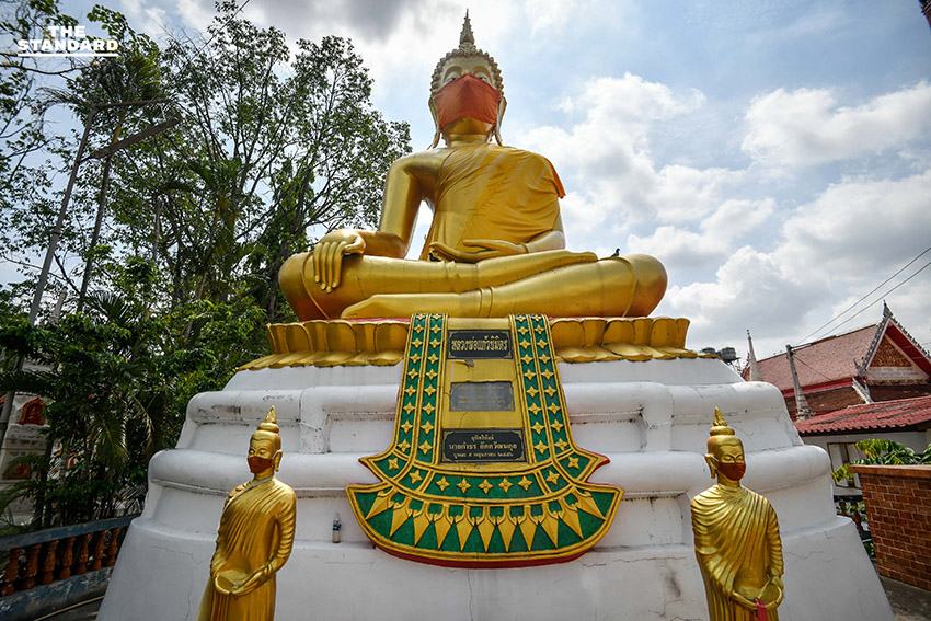 THE STANDARD สำรวจบริเวณวัดนิเทศราษฎร์ประดิษฐ์ จังหวัดปทุมธานี พบพระพุทธรูปองค์ใหญ่ที่มีความสูงประมาณ 10 เมตร ประดิษฐานบริเวณหน้าวัดพร้อมสวมหน้ากากอนามัย พร้อมไวนิลลักษณะอาการและการติดเชื้อโควิด-19