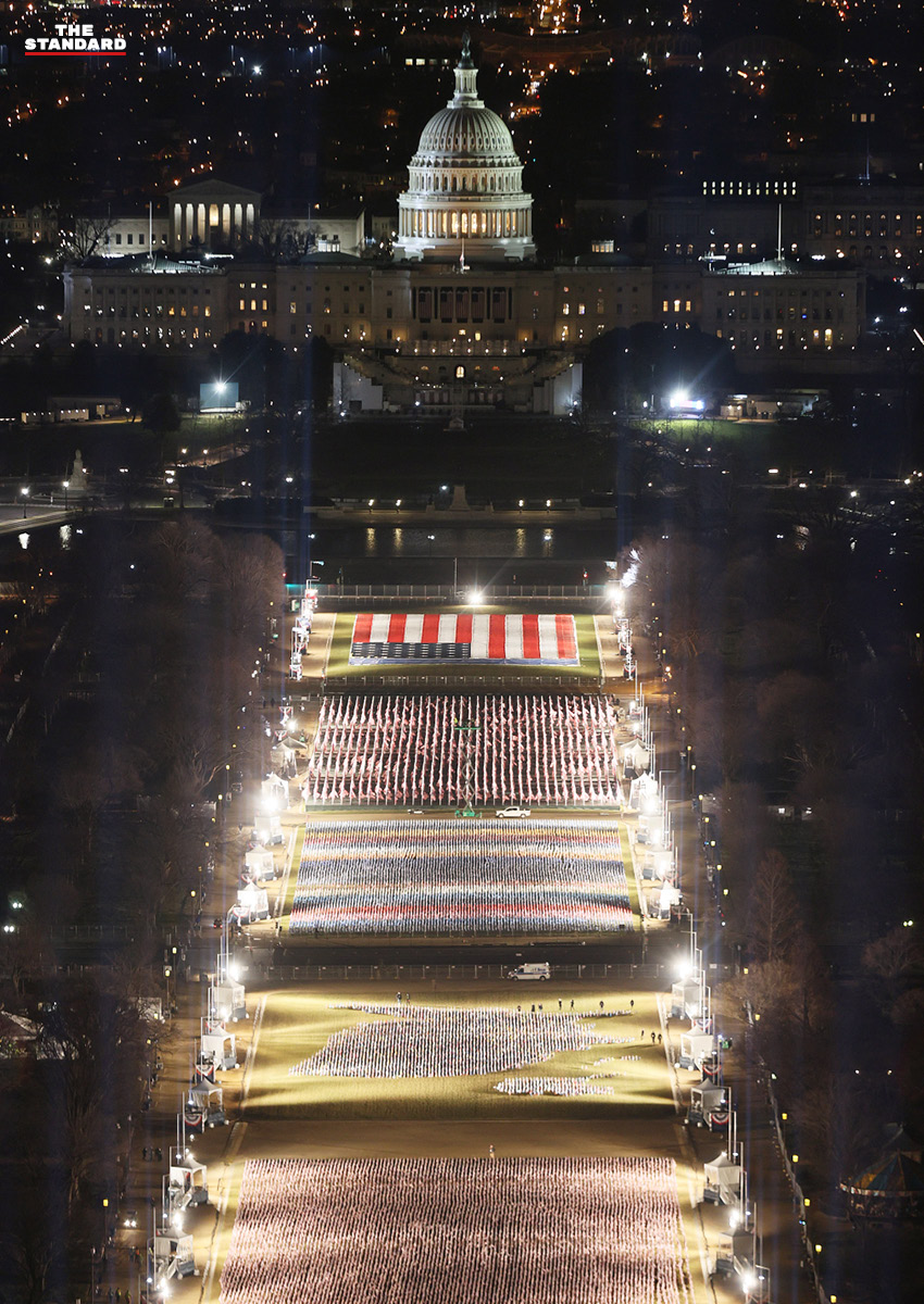 ช่วงค่ำจะมีการจัดแสดงแสงสีเป็นแนวยาวตลอดทั้งสนาม 56 ลำแสงที่สื่อแทน 56 รัฐและดินแดนทั่วประเทศถูกฉายสาดส่องขึ้นท้องฟ้า ก่อนหน้าพิธีสาบานตนเข้ารับตำแหน่งอย่างเป็นทางการของ โจ ไบเดน ว่าที่ประธานาธิบดีคนที่ 46 ของสหรัฐอเมริกาและคามาลา (กมลา เทวี) แฮร์ริส ว่าที่รองประธานาธิบดีหญิงคนแรกในประวัติศาสตร์การเมืองอเมริกันจะมีขึ้นในวันที่ 20 มกราคมนี้ ตามเวลาท้องถิ่น โดยธงขนาดเล็กเกือบ 2 แสนผืนเป็นตัวแทนของพลเมืองอเมริกันทั่วสหรัฐฯ ที่อาจเดินทางมาร่วมพิธีสำคัญนี้ในเมืองหลวงไม่ได้ เนื่องจากสถานการณ์การแพร่ระบาดของโควิด-19