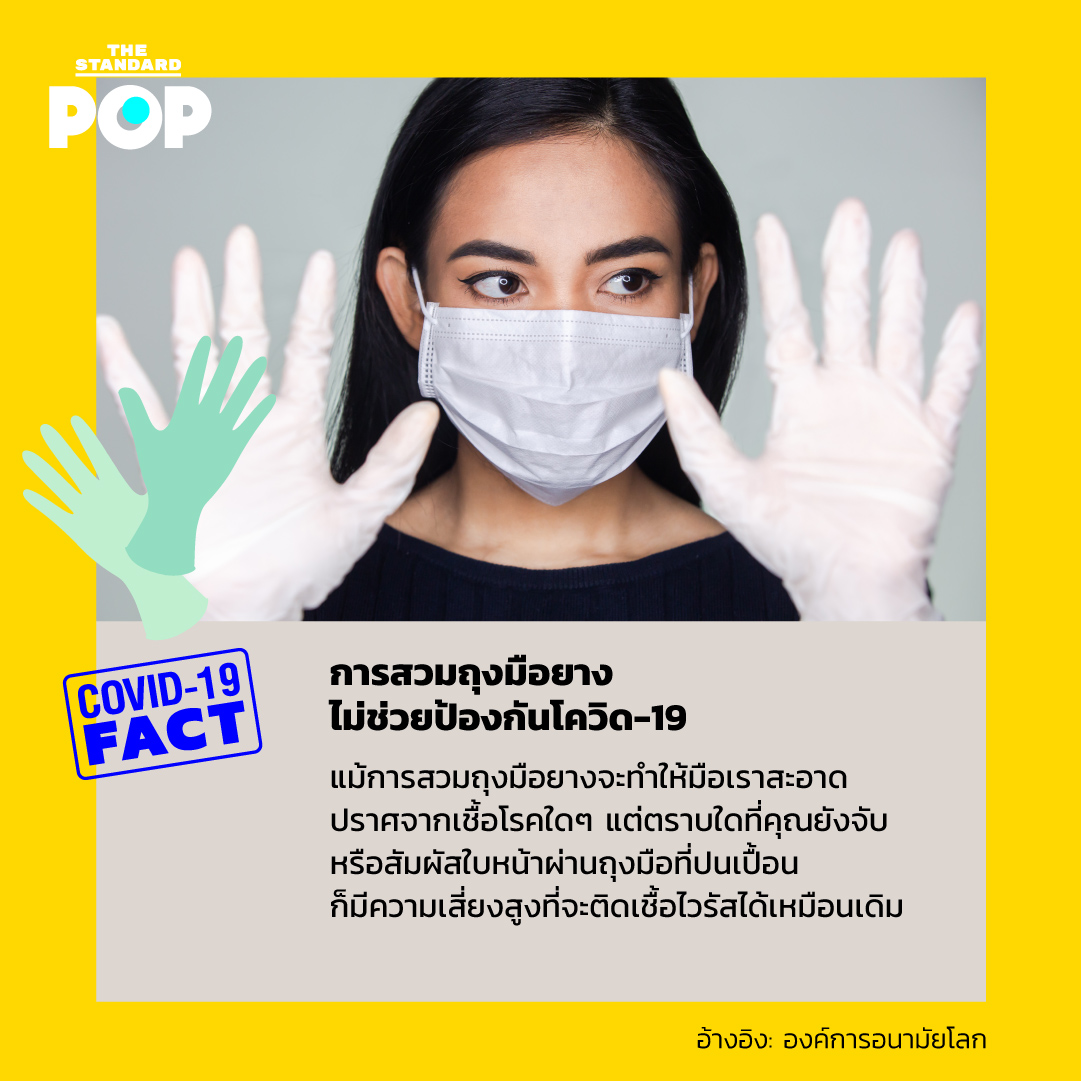 ประเด็นนี้องค์การอนามัยโลกให้เหตุผลว่า แม้การสวมถุงมือยางจะทำให้มือเราสะอาด ปราศจากเชื้อโรคใดๆ แต่ตราบใดที่คุณยังจับหรือสัมผัสใบหน้าผ่านถุงมือที่ปนเปื้อน ก็มีความเสี่ยงสูงที่จะติดเชื้อไวรัสได้เหมือนเดิม