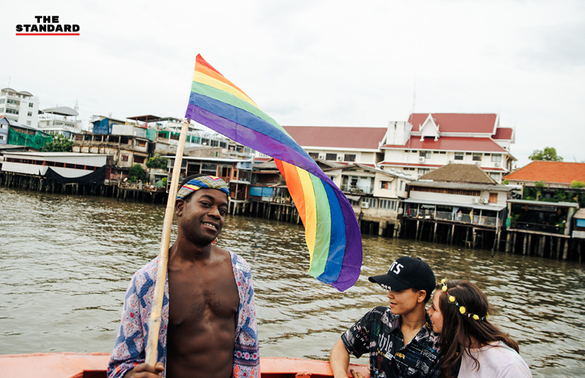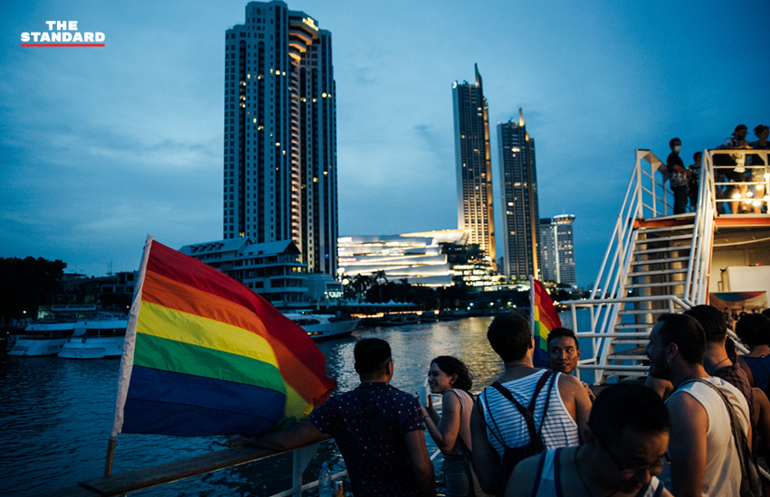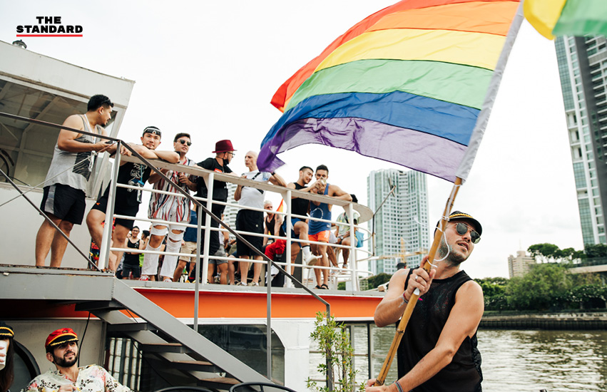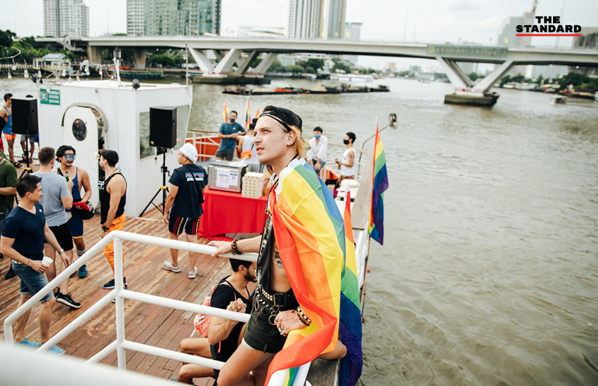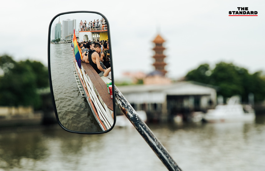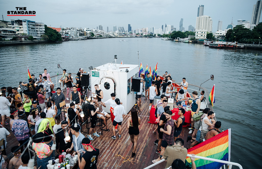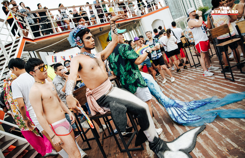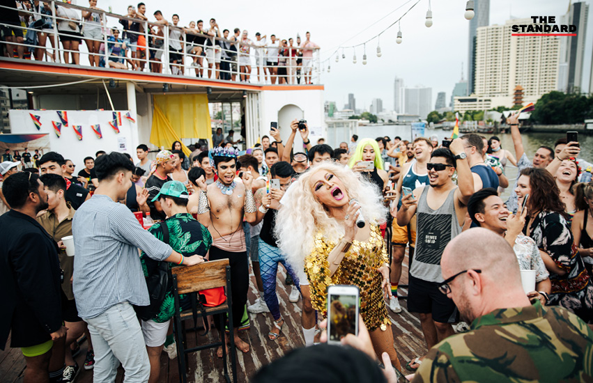 ทาง THE STANDARD ได้เก็บภาพบรรยากาศบนเรือที่โลดแล่นไปในแม่น้ำเจ้าพระยายามเย็น ถูกประดับไปด้วยธงสีรุ้ง การเล่นน้ำสงกรานต์ และมีกิจกรรมการแสดงต่างๆ จาก Drag Queen