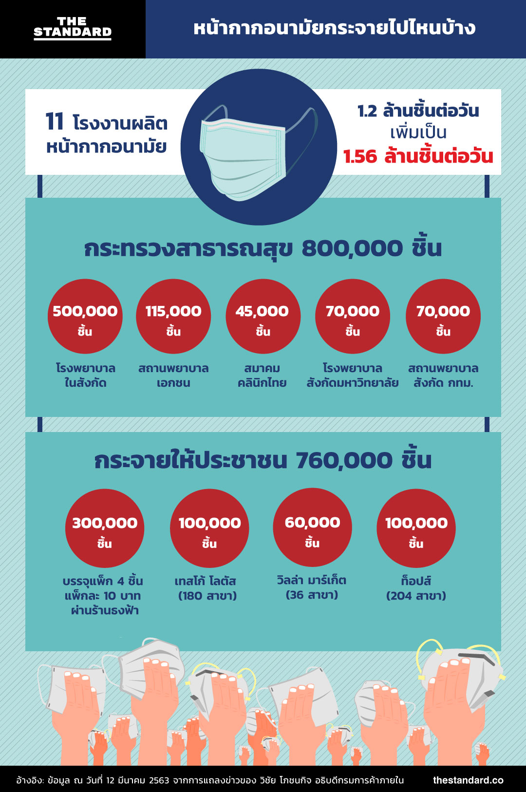 วันนี้ (12 มีนาคม) วิชัย โภชนกิจ อธิบดีกรมการค้าภายใน กระทรวงพาณิชย์ เปิดเผยว่า กระทรวงพาณิชย์ได้ขอความร่วมมือให้โรงงานที่ผลิตหน้ากากอนามัยแบบชนิดที่ไม่ใช้ในประเทศเปลี่ยนสายการผลิตมาทำ Surgical Mask ที่ใช้ในประเทศไทย ทำให้สถานการณ์จากที่เคยผลิตหน้ากากอนามัยได้วันละ 1.2 ล้านชิ้น วันนี้เพิ่มเป็น 1.56 ล้านชิ้น