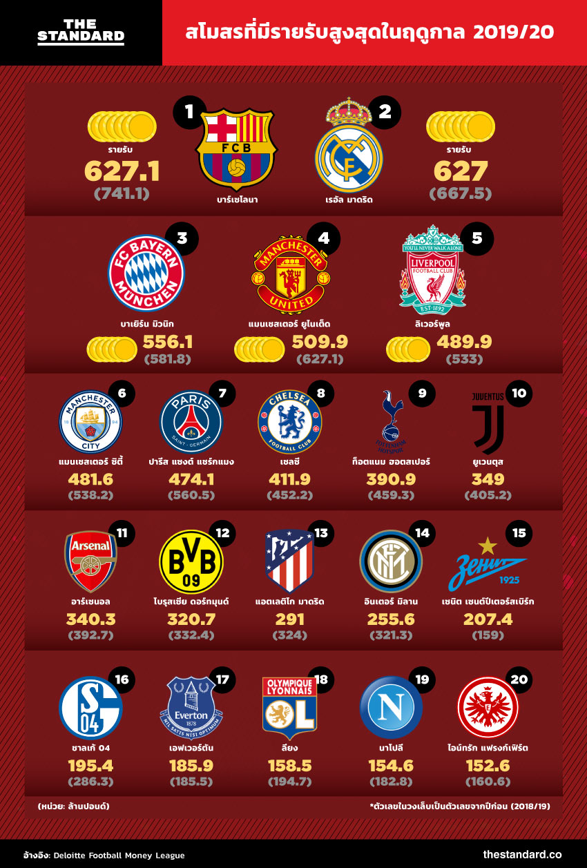 ปัจจัยของการชะลอการใช้จ่าย Deloitte คาดว่าผลกระทบจากโควิด-19 จะทำให้สโมสรที่ร่ำรวยที่สุด 20 อันดับแรกสูญเสียรายได้รวมกันมากถึง 2 พันล้านยูโร