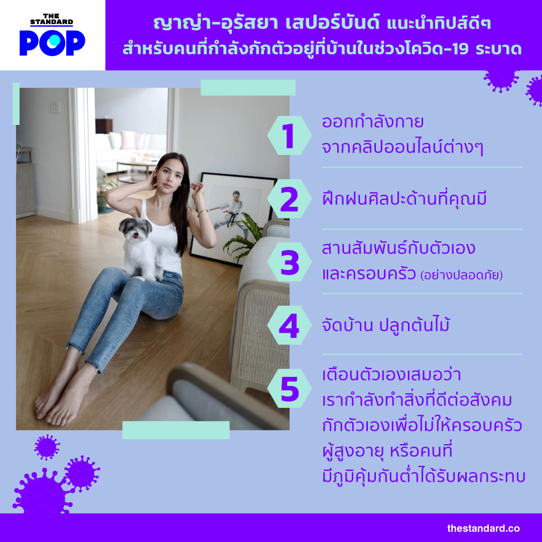 การเป็นนักแสดงระดับซูเปอร์สตาร์ ไม่เพียงจะเป็นที่รักและชื่นชมในกลุ่มของแฟนคลับที่ติดตามผลงานเท่านั้น แต่เมื่อแฟนคลับต้องการกำลังใจและคำแนะนำจากดารา หลายคนก็พร้อมช่วยเหลือและให้กำลังใจเต็มที่ อย่างกรณีล่าสุดมีแฟนคลับส่งคำถามถึงนางเอก ญาญ่า-อุรัสยา เสปอร์บันด์ ทาง Instagram Stories ว่า อยากได้ทิปส์สำหรับคนที่อยู่ในช่วงกักกันตัวเองอยู่ที่บ้าน และญาญ่าก็ตอบคำถามกลับไป ซึ่งเป็นทิปส์ดีๆ ที่ THE STANDARD POP เห็นว่ามีประโยชน์และน่าลองทำสำหรับคนอื่นๆ ด้วย ไปดูกันว่าญาญ่าแนะนำอะไรบ้าง