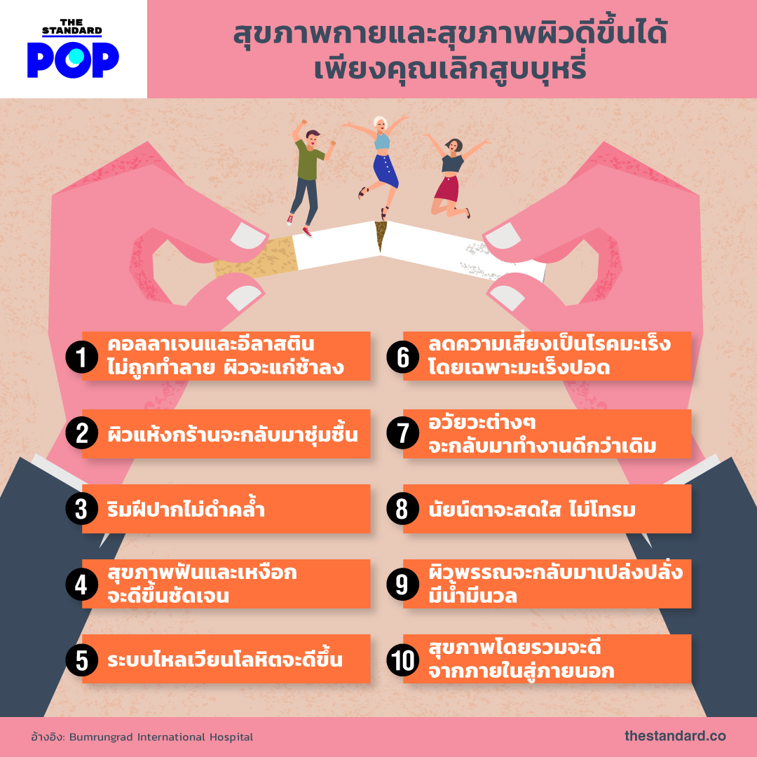 วันที่ 31 พฤษภาคมของทุกปี เป็นวันงดสูบบุหรี่โลก ซึ่งจัดขึ้นโดยองค์การอนามัยโลก เพื่อให้ประชากรโลกทุกคนเห็นถึงอันตรายของบุหรี่ต่อสุขภาพ THE STANDARD POP เองก็อยากเห็นคนไทยทุกคนไม่ว่าจะเป็นคุณผู้ชายหรือคุณผู้หญิง ตระหนักถึงโทษอันตรายของบุหรี่ หากคุณยังเลิกไม่ได้ปุบปับ อาจเริ่มจากการลดปริมาณการสูบบุรี่ลงเรื่อยๆ จนสามารถเลิกได้ ถ้าคุณก้าวพ้นวงจรติดบุหรี่ไปได้ เชื่อเถอะว่าโลกที่สดใสต่อกาย ใจ และสุขภาพรอคุณอยู่ที่ปลายทางแน่นอน ต่อไปนี้คือผลพลอยได้ที่มีแต่สิ่งดีๆ ทั้งนั้น ที่จะเกิดขึ้นกับสุขภาพและผิวพรรณของคุณ หากคุณเลิกบุหรี่ได้สำเร็จ