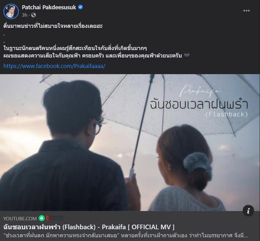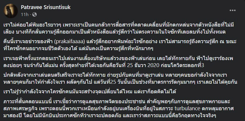 เมื่อวันที่ 26 มิถุนายนที่ผ่านมา ได้เกิดข่าวเศร้าในวงการดนตรีขึ้น เมื่อ ฟ้า-ประกายฟ้า พูลด้วง ศิลปินอิสระและยูทูเบอร์สาวจากช่อง Prakaifa ถูกพบว่าเสียชีวิตจากการกระโดดตึกสูง ณ บริเวณอาคารจอดรถด้านหลังห้างสรรพสินค้าแห่งหนึ่ง โดยคาดว่าสาเหตุของการตัดสินใจจบชีวิตตัวเองเกิดจากความเครียดเนื่องจากไม่มีงานและขาดรายได้ หลังโควิด-19 กลับมาแพร่ระบาดอีกครั้งจนส่งผลกระทบให้อาชีพศิลปินอิสระขาดรายได้